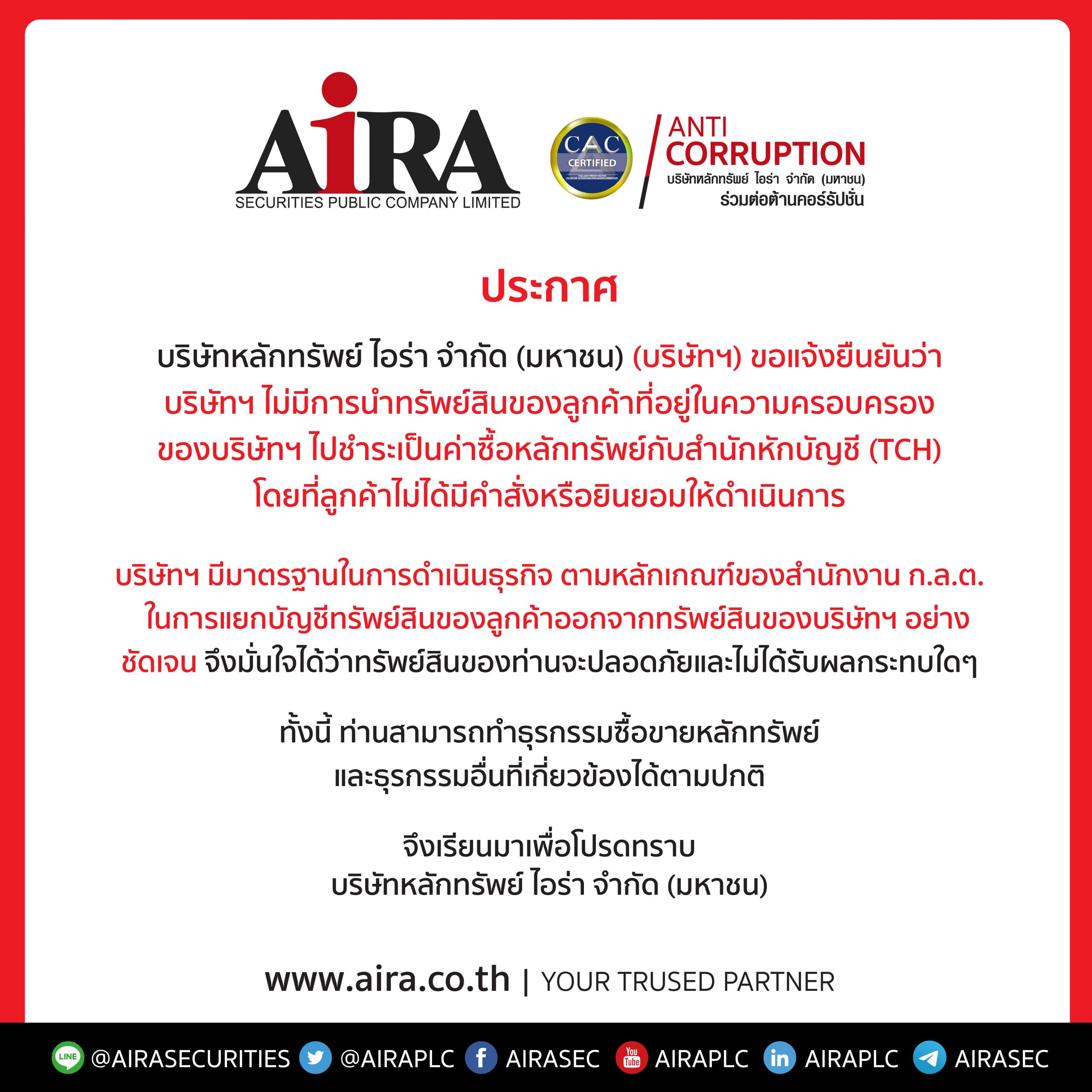 ทั้งนี้ บล.ไอร่า จำกัด (มหาชน) มีมาตรฐานในการดำเนินธุรกิจ ตามหลักเกณฑ์ของสำนักงานคณะกรรมการกำกับหลักทรัพย์และตลาดหลักทรัพย์ (“ก.ล.ต.”) ในการแยกบัญชีทรัพย์สินของลูกค้าออกจากทรัพย์สินของบริษัทฯอย่างชัดเจน จึงอยากจะตอกย้ำให้ทุกฝ่ายที่เกี่ยวข้องมั่นใจว่าทรัพย์สินของทุกท่านปลอดภัยและไม่ได้รับผลกระทบใดๆอย่างแน่นอน ทั้งนี้ท่านสามารถทำธุรกรรมซื้อขายหลักทรัพย์และธุรกรรมอื่นๆที่เกี่ยวข้องได้ตามปกติ