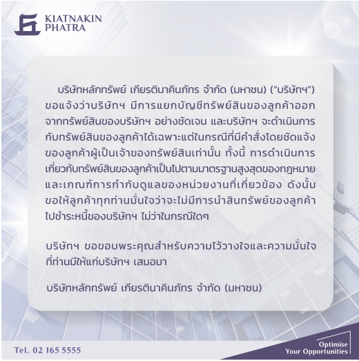 Public : 18/11/2022บริษัทหลักทรัพย์ เกียรตินาคินภัทร จำกัด (มหาชน) ขอแจ้งว่าบริษัทฯ มีการแยกบัญชีทรัพย์สินของลูกค้าออกจากทรัพย์สินของบริษัทฯ อย่างชัดเจน และบริษัทฯ จะดำเนินการกับทรัพย์สินของลูกค้าได้เฉพาะแต่ในกรณีที่มีคำสั่งโดยชัดแจ้งของลูกค้าผู้เป็นเจ้าของทรัพย์สินเท่านั้น ทั้งนี้ การดำเนินการเกี่ยวกับทรัพย์สินของลูกค้าเป็นไปตามมาตรฐานสูงสุดของกฎหมาย และเกณฑ์การกำกับดูแลของหน่วยงานที่เกี่ยวข้อง ดังนั้น ขอให้ลูกค้าทุกท่านมั่นใจว่าจะไม่มีการนำสินทรัพย์ของลูกค้าไปชำระหนี้ของบริษัทฯ ไม่ว่าในกรณีใดๆ
