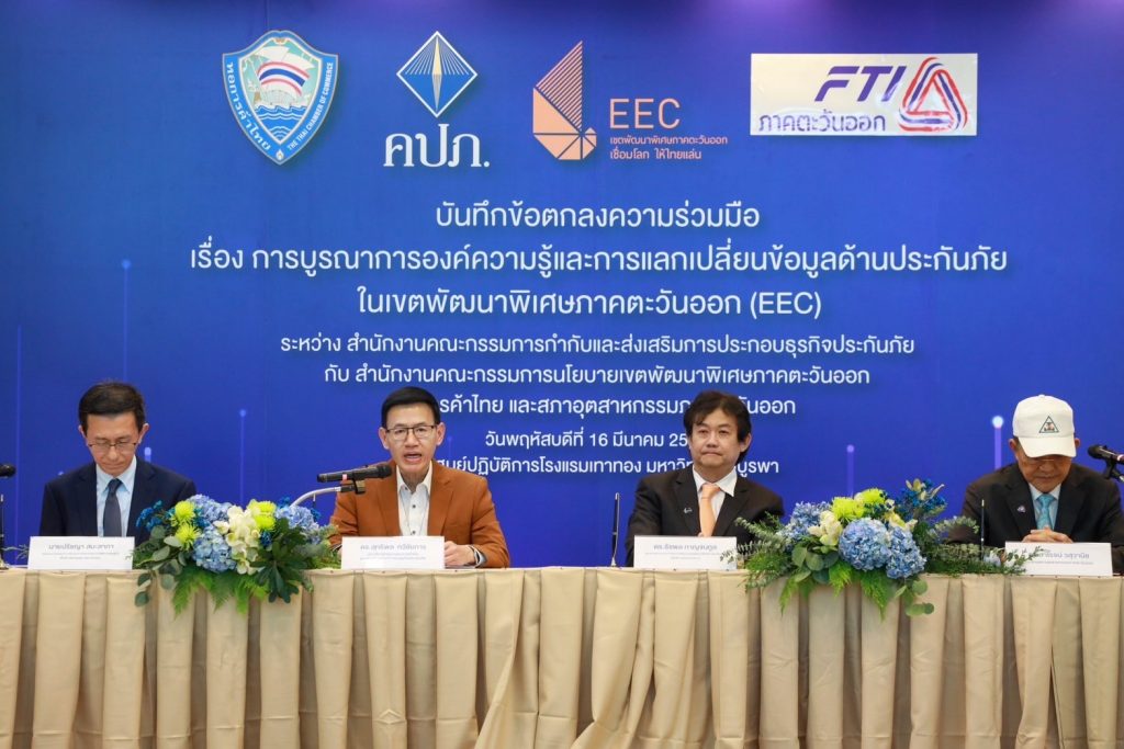 เมื่อวันที่ 16 มีนาคม 2566 ดร.สุทธิพล ทวีชัยการ เลขาธิการคณะกรรมการกำกับและส่งเสริมการประกอบธุรกิจประกันภัย (เลขาธิการ คปภ.) พร้อมด้วย ดร.ธัชพล กาญจนกูล รองเลขาธิการคณะกรรมการนโยบายเขตพัฒนาพิเศษภาคตะวันออก ปฏิบัติการแทนเลขาธิการคณะกรรมการนโยบายเขตพัฒนาพิเศษภาคตะวันออก นายปรัชญา สมะลาภา รองประธานกรรมการและประธานคณะกรรมการพัฒนาเศรษฐกิจพื้นที่ภาคตะวันออก หอการค้าไทย ดร.สาโรจน์ วสุวานิช ประธานสภาอุตสาหกรรมภาคตะวันออก ร่วมลงนามในบันทึกข้อตกลงความร่วมมือ (MoU) เรื่องการบูรณาการองค์ความรู้และการแลกเปลี่ยนข้อมูลด้านประกันภัยในเขตพัฒนาพิเศษภาคตะวันออก (EEC) ระหว่าง 4 หน่วยงาน คือ สำนักงานคณะกรรมการกำกับและส่งเสริมการประกอบธุรกิจประกันภัย (สำนักงาน คปภ.) สำนักงานคณะกรรมการนโยบายเขตพัฒนาพิเศษภาคตะวันออก (สกพอ.) หอการค้าไทย และสภาอุตสาหกรรมภาคตะวันออก โดยได้รับเกียรติจาก นายนิติ วิวัฒน์วานิช รองผู้ว่าราชการจังหวัดชลบุรี คณะผู้บริหารระดับสูงของทั้ง 4 หน่วยงาน นายจีรพันธ์ อัศวะธนกุล รองประธานกรรมการหอการค้าไทย นายสุนทร ธัญญวัฒนกุล ประธานหอการค้ากลุ่มจังหวัดภาคตะวันออก 1 ประธานหอการค้าจังหวัด ประธานสภาอุตสาหกรรมจังหวัดในพื้นที่ EEC (ชลบุรี ระยอง และ ฉะเชิงเทรา) ผู้บริหารภาครัฐและเอกชน รวมถึงสื่อมวลชนร่วมเป็นสักขีพยาน ณ ศูนย์ปฏิบัติการโรงแรมเทาทอง มหาวิทยาลัยบูรพา อำเภอเมือง จังหวัดชลบุรี