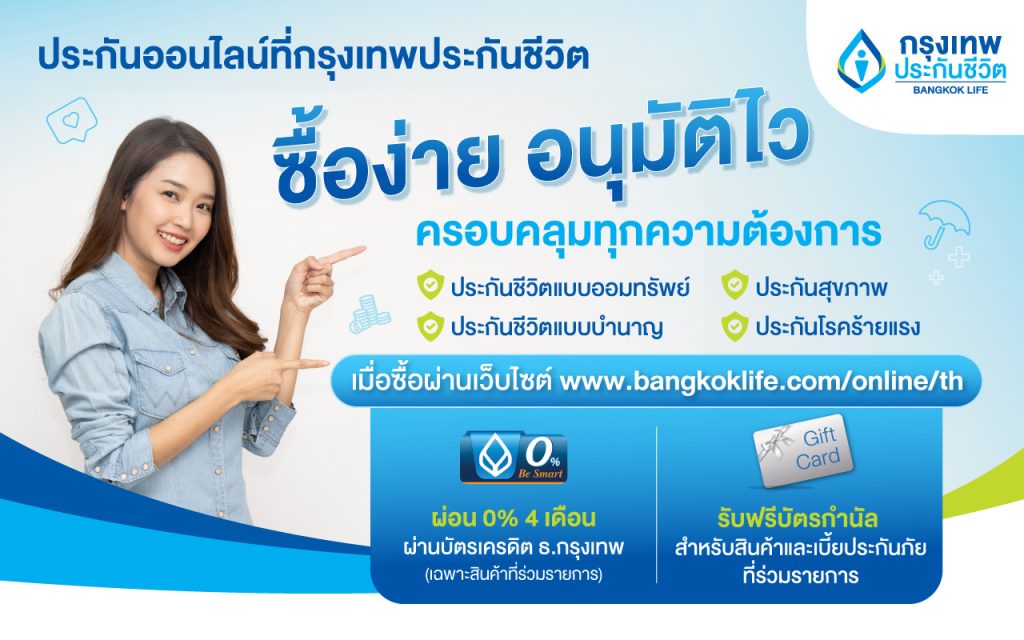 กรุงเทพประกันชีวิต เดินหน้ารุกตลาดประกันชีวิตออนไลน์ พัฒนาแพลตฟอร์มดิจิทัลที่สะดวกปลอดภัย ครอบคลุมทุกความต้องการด้วยผลิตภัณฑ์ประกันชีวิตที่หลากหลาย ทั้งแบบประกันชีวิตออมทรัพย์ ประกันชีวิตแบบบำนาญ ประกันสุขภาพ และประกันโรคร้ายแรง เพื่อการใช้ชีวิตที่อุ่นใจ พร้อมชูจุดเด่นในการเลือกซื้อง่าย อนุมัติไว สามารถคำนวณเบี้ยประกันภัยและสมัครด้วยตัวเอง ครบ จบที่เดียว ผ่านเว็บไซต์ www.bangkoklife.com/online พร้อมรับความคุ้มครองและกรมธรรม์อิเล็กทรอนิกส์ (e-Policy)