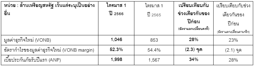 - มูลค่าธุรกิจใหม่ (VONB) เติบโตร้อยละ 28 อยู่ที่ 1,046 ล้านเหรียญสหรัฐ