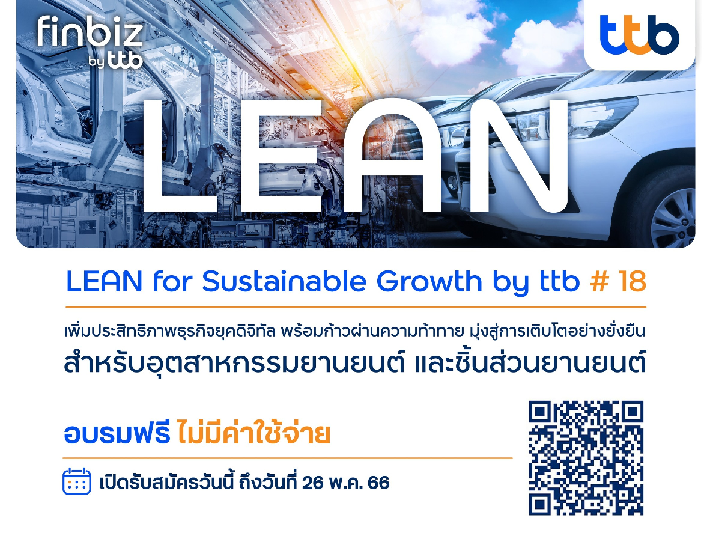 ทีทีบี เปิดรับสมัครหลักสูตรอบรม LEAN for Sustainable Growth by ttb รุ่น 18 สำหรับอุตสาหกรรมยานยนต์และชิ้นส่วนยานยนต์ เพิ่มประสิทธิภาพธุรกิจยุคดิจิทัล