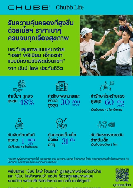 บมจ. ชับบ์ ไลฟ์ แอสชัวรันซ์ หรือ ชับบ์ ไลฟ์ ประกันชีวิต เปิดตัวสัญญาเพิ่มเติมค่ารักษาพยาบาลและผ่าตัด(รพ.) เฮลท์ พรีเมียม เอ็กซ์ตร้า แบบมีความรับผิดส่วนแรก ซึ่งเป็นประกันสุขภาพเหมาจ่ายทางเลือกใหม่ ที่ออกแบบมาเอาใจลูกค้าวัยทำงานที่ต้องการความคุ้มครองที่สูงขึ้น เพิ่มเติมจากกสวัสดิการหรือประกันสุขภาพที่มีอยู่แล้ว เพื่อให้ครอบคลุมกับค่ารักษาพยาบาลในปัจจุบันที่เพิ่มขึ้นอย่างต่อเนื่อง ด้วยเบี้ยฯ ราคาเบากระเป๋า ซึ่งถูกกว่าประกันสุขภาพเหมาจ่ายแบบปกติสูงสุดถึง 48%*