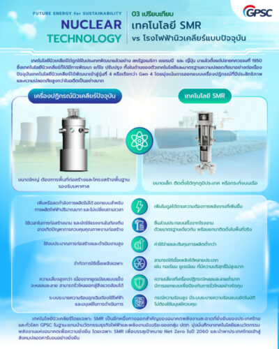 อีกทั้งไม่มีการปล่อยคาร์บอนไดออกไซด์ระหว่างกระบวนการผลิตไฟฟ้า อย่างไรก็ดี การพัฒนาโครงการโรงไฟฟ้า SMR จำเป็นต้องศึกษารายละเอียดหลายด้าน ทั้งการเลือกพื้นที่ที่เหมาะสม เทคโนโลยีเฉพาะ การจัดการความปลอดภัย และความคุ้มค่าทางเศรษฐกิจ ซึ่ง GPSC กำลังดำเนินการศึกษาอย่างรอบคอบตามกรอบแผนพัฒนากำลังผลิตไฟฟ้าของประเทศหรือ PDP 2024 ซึ่งได้กำหนดขนาดกำลังผลิตไว้ที่ 600 เมกะวัตต์ โดยคาดว่าจะเริ่มดำเนินการได้ในช่วงปลายแผนปี 2580