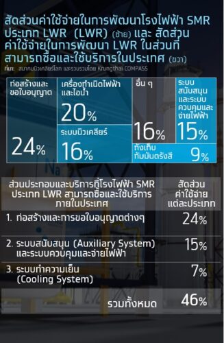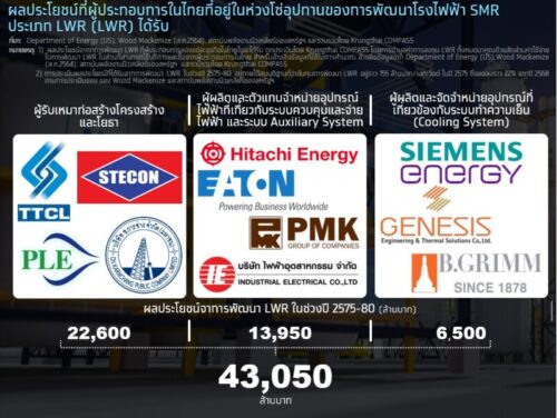 การลงทุน SMR ของ กฟผ.ดังกล่าวคาดว่าจะสร้างรายได้กับธุรกิจในห่วงโซ่อุปทานของการพัฒนา SMR ราว 3 หมื่นล้านบาท ในช่วงปี 2575-80 โดยธุรกิจที่ได้รับประโยชน์จากการลงทุนดังกล่าว มากที่สุด คือ ธุรกิจรับเหมาก่อสร้างและโยธา ซึ่งคาดว่าจะสามารถสร้างรายได้ให้ผู้ประกอบการในกลุ่มนี้ราว 2.26 หมื่นล้านบาท ในช่วงเวลาดังกล่าว
