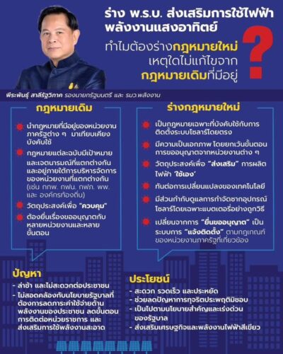 "ขอเชิญชวนประชาชนร่วมแสดงความคิดเห็น ต่อร่าง พ.ร.บ. ส่งเสริมการใช้ไฟฟ้าพลังงานแสงอาทิตย์ ซึ่งเป็นกฎหมายสำคัญที่จะเปิดโอกาสให้ประชาชนผลิตไฟฟ้าใช้เองได้สะดวกขึ้น ลดภาระค่าใช้จ่ายในครัวเรือน และสนับสนุนการใช้พลังงานสะอาดอย่างเป็นรูปธรรม"