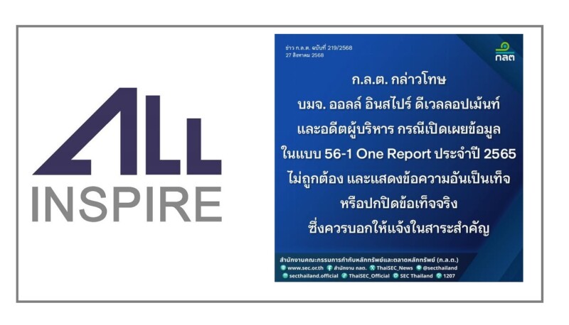 ก.ล.ต. กล่าวโทษ ออลล์ อินสไปร์ ดีเวลลอปเม้นท์ และอดีตผู้บริหาร แจ้งข้อมูลเท็จหรือปกปิดข้อเท็จจริงกรณีพิพาททางกฎหมาย