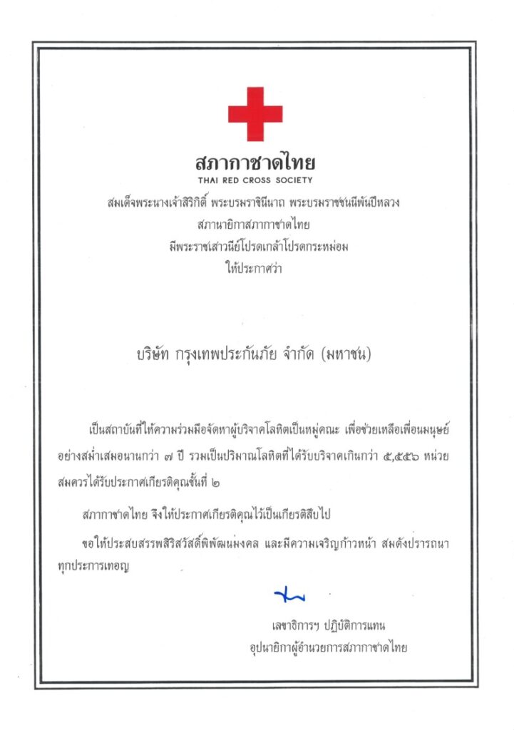 บริษัท กรุงเทพประกันภัย จำกัด (มหาชน) ได้รับใบประกาศเกียรติคุณชั้นที่ 2 จากสภากาชาดไทย ในฐานะองค์กรที่ให้การสนับสนุนและความร่วมมือในการจัดหาผู้บริจาคโลหิตเป็นหมู่คณะอย่างต่อเนื่อง โดยบริษัทฯ ได้ดำเนินโครงการบริจาคโลหิตมาตั้งแต่ปี 2531 และจัดกิจกรรมทุก 3 เดือน เพื่อสนับสนุนการสำรองโลหิตให้เพียงพอสำหรับการรักษาผู้ป่วยในโรงพยาบาลต่างๆ ทั่วประเทศ ถือเป็นการต่อชีวิตและยกระดับคุณภาพชีวิตที่ดีของคนในสังคม ควบคู่ไปกับการขับเคลื่อนนโยบายพัฒนาองค์กรอย่างยั่งยืน ตลอดระยะเวลากว่า 3 ทศวรรษที่ผ่านมา บริษัทฯ มุ่งมั่นสร้างสังคมแห่งการแบ่งปัน ด้วยการเชิญชวนผู้บริหาร พนักงาน ลูกค้า คู่ค้า ตลอดจนประชาชนทั่วไป เข้าร่วมกิจกรรมบริจาคโลหิต รวมถึงการบริจาคอวัยวะและดวงตา เพื่อสนับสนุนภารกิจของสภากาชาดไทย อันเป็นการสืบสานเจตนารมณ์แห่งการให้และการช่วยเหลือเพื่อนมนุษย์อย่างแท้จริง