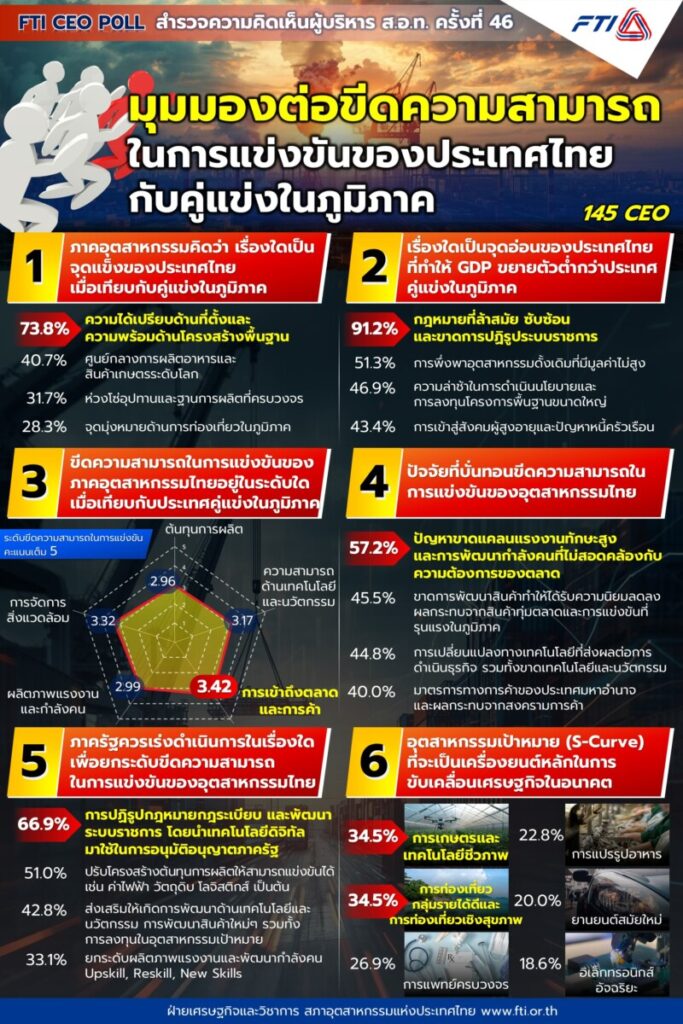 จากการสำรวจผู้บริหาร ส.อ.ท. (CEO Survey) จำนวน 145 ท่าน ครอบคลุม 47 กลุ่มอุตสาหกรรม และ 76 สภาอุตสาหกรรมจังหวัด สามารถสรุปผลการสำรวจ FTI CEO Poll ครั้งที่ 46 จาก 6 คำถามได้ดังนี้