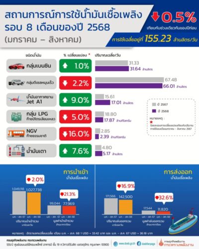 ปริมาณการใช้ Jet A1 เฉลี่ยอยู่ที่ 17.01 ล้านลิตร/วัน เพิ่มขึ้นร้อยละ 9.0 ยังคงขยายตัวอย่างต่อเนื่องจากปีก่อน โดยจำนวนผู้เยี่ยมเยือนทั้งคนไทยและต่างชาติขยายตัวร้อยละ 1.64 รวมไปถึงการขยายตัวของบริการขนส่งสินค้าทางอากาศ ในขณะที่นักท่องเที่ยวต่างชาติที่เดินทางเข้าประเทศไทยสะสม 8 เดือนของปี 2568 มีจำนวน 21.87 ล้านคน ลดลงร้อยละ 6.4 ซึ่งเป็นการลดลงของนักท่องเที่ยวชาวเอเชียตะวันออกเฉียงเหนือ (โดยเฉพาะจีน) ที่ลดลงร้อยละ 25.95 เมื่อเทียบกับปีก่อน จากการแข่งขันในภูมิภาคที่รุนแรงขึ้น รวมถึง ททท. ได้มีการปรับลดคาดการณ์นักท่องเที่ยวต่างชาติเดินทางเข้าประเทศไทยจากเดิมคาดการณ์ไว้ที่ 40 ล้านคน เหลือ 33.4 ล้านคน ซึ่งลดลงร้อยละ 6 เมื่อเทียบกับปีก่อน