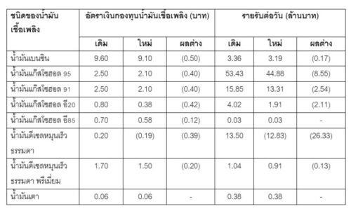 กบน.มีมติปรับลดอัตราเงินกองทุนน้ำมันเชื้อเพลิงสำหรับน้ำมันดีเซลลง 0.39 บาทต่อลิตร และน้ำมันน้ำมันเบนซินทุกชนิดลง 0.40 – 0.50 บาท ยกเว้นน้ำมันแก๊สโซฮอล อี85 ลดลง 0.12 บาท เพื่อตรึงราคาขายปลีกน้ำมันดีเซล