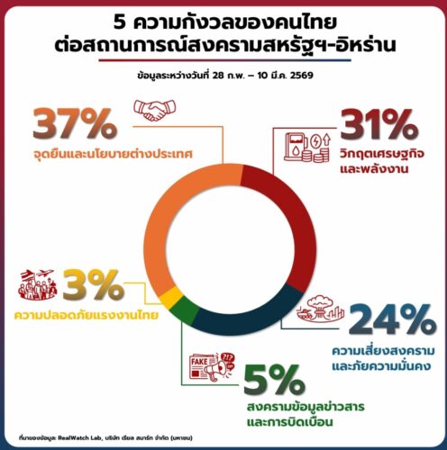 “เรียลวอทช์ แล๊ป” สำรวจ ความกังวลของชาวเน็ตไทย พบว่า 68% กังวลเรื่อง จุดยืนด้านการต่างประเทศ และ วิกฤตเพลังงาน จากสถานการณ์การสู้รบในอ่าวเปอร์เซีย ระหว่าง สหรัฐอเมริกา อิสราเอล กับ อิหร่าน