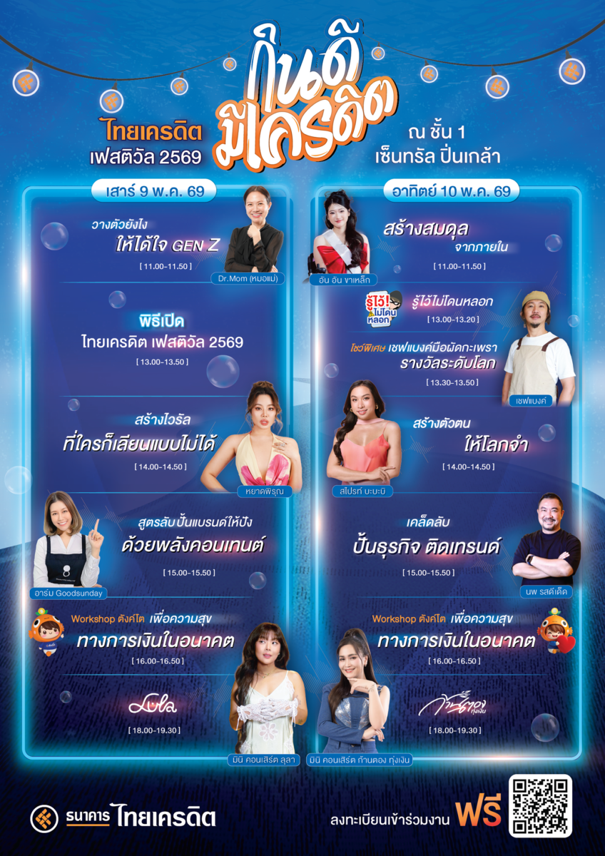 Public : 29/04/2026ธนาคารไทยเครดิต จำกัด (มหาชน) เตรียมจัดงาน “ไทยเครดิต เฟสติวัล 2569 กินดี มีเครดิต” ระหว่างวันที่ 9-10 พฤษภาคม 2569 ณ ชั้น 1 ศูนย์การค้าเซ็นทรัล ปิ่นเกล้า เปิดพื้นที่แห่งการเรียนรู้ด้านการเงิน การพัฒนาตนเอง และการสร้างอาชีพให้คนรุ่นใหม่ ผู้ประกอบการรายย่อย และประชาชนทั่วไป ให้เข้าถึงองค์ความรู้ในการพัฒนาตนเอง สร้างแรงบันดาลใจ และต่อยอดอาชีพอย่างยั่งยืนภายในงานพบกับเวทีเสวนา และทอล์กสร้างพลังจากกูรูและอินฟลูเอนเซอร์ชื่อดัง อาทิ Dr.Mum, อาร์ม Goodsunday, หยาดพิรุณ และสไปรท์ บะบะบิ ที่จะมาแชร์เทคนิคสร้างตัวตน ปั้นแบรนด์ และทำคอนเทนต์ให้โดดเด่นในยุคดิจิทัล พร้อมอัปเดตความรู้การเงินที่นำไปใช้ได้จริง