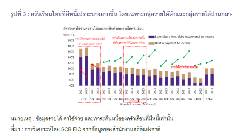 แม้ตัวเลขสัดส่วนหนี้ครัวเรือนต่อ GDP ของไทยในภาพรวมจะลดลงต่อเนื่องในช่วง 2 ไตรมาสแรกของปี 2024 แต่ภาพที่ดูเหมือนจะคืบหน้านี้ เกิดขึ้นเพราะตัวเลขหนี้ครัวเรือนขยายตัวต่ำเป็นประวัติการณ์เป็นหลัก ตามความเสี่ยงของลูกหนี้รายย่อยที่เพิ่มขึ้นมาก ขณะที่ตัวเลข GDP ขยายตัวได้ต่ำ หากสถานการณ์ตัวเลขหนี้ครัวเรือนและตัวเลข GDP ไทยขยายตัวต่ำทั้งคู่ยังคงดำเนินต่อไป อาจเห็นผลลบต่อการฟื้นตัวของรายได้ครัวเรือนในอนาคตตามมา ยิ่งจะทำให้การใช้คืนหนี้เดิมทำได้ยากขึ้น
