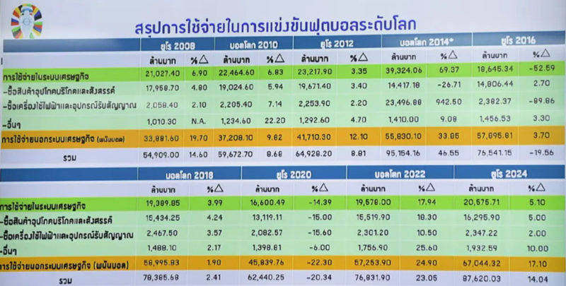 นายธนวรรธน์กล่าวว่า จากการสำรวจการใช้จ่ายในการแข่งขันฟุตบอลยูโร 2024 พบว่าอยู่ที่ 87,620 ล้านบาท แยกเป็นการใช้จ่ายในระบบเศรษฐกิจ 20,575 ล้านบาท เช่น ซื้อสินค้าอุปโภคบริโภคและสังสรรค์ ซื้อเครื่องใช้ไฟฟ้า อุปกรณ์รับสัญญาณ และการใช้จ่ายนอกระบบเศรษฐกิจ(พนันบอล) อยู่ที่ 67,044.32 ล้านบาท เติบโตสูงขึ้นเป็นประวัติการณ์ แบ่งเป็นสองกลุ่มทั้งการพนันในเว็บไซต์และพนันกับเพื่อน