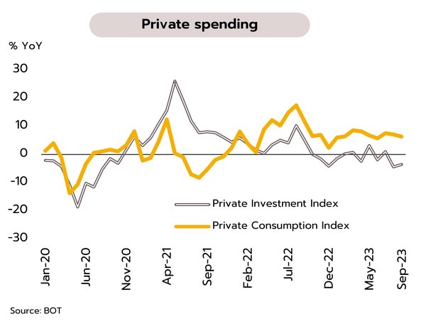 อย่างไรก็ตาม คาดว่าการบริโภคจะเติบโตได้ตามการจ้างงานและความเชื่อมั่นที่ปรับดีขึ้น รวมทั้งยังได้อานิสงส์ของมาตรการบรรเทาภาระค่าครองชีพจากการปรับลดค่าใช้จ่ายด้านพลังงาน ซึ่งล่าสุดขยายการปรับลดราคาน้ำมันเชื้อเพลิงในกลุ่มเบนซินเพิ่มเติม จากก่อนหน้าที่มีมาตรการปรับลดราคาน้ำมันดีเซลและค่าไฟฟ้า นอกจากนี้ ในส่วนของภาคท่องเที่ยวที่ทยอยฟื้นตัวยังได้แรงสนับสนุนเพิ่มเติมจากมาตรการวีซ่าฟรีชั่วคราวแก่นักท่องเที่ยวหลายประเทศเพิ่มมากขึ้น
