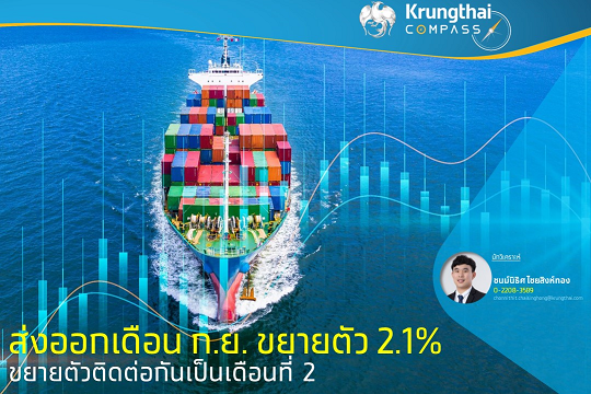 ทั้งนี้ การส่่งออกเดือน ก.ย. ขยายตัว 2.1%YoY เป็นการขยายตัวติดต่อกันเป็นเดือนที่ 2 ตามการส่งออกสินค้าเกษตรที่ขยายตัวต่อเนื่อง และสินค้าอุตสาหกรรมเกษตรที่กลับมาขยายตัว ขณะที่สินค้าอุตสาหกรรมกลับมาหดตัวเล็กน้อย สำหรับการนำเข้าหดตัวที่ -8.3% ส่งผลให้ดุลการค้าในเดือน ก.ย. เกินดุลต่อเนื่องเป็นเดือนที่ 2 ณ ระดับ 2,092.7 ล้านดอลลาร์ฯ