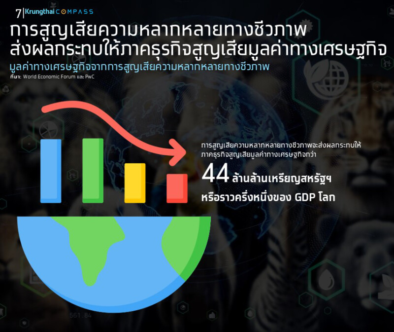 ดร.สุปรีย์ ศรีสำราญ ผู้อำนวยการฝ่าย ศูนย์วิจัย Krungthai COMPASS เปิดเผยว่า Biodiversity กำลังได้รับความสนใจจากทั่วโลกมากขึ้น โดยข้อมูลของ World Economic Forum ประเมินว่า การสูญเสียความหลากหลายทางชีวภาพอาจส่งผลกระทบทางเศรษฐกิจกว่า 44 ล้านล้านเหรียญสหรัฐฯ หรือราวครึ่งหนึ่งของ GDP โลก สะท้อนให้เห็นถึงความเชื่อมโยงอย่างมีนัยสำคัญระหว่างธรรมชาติกับเศรษฐกิจ ขณะที่บริษัทขนาดใหญ่ระดับโลกในกลุ่ม Fortune Global 500 มีแนวโน้มขยายพันธกิจด้านสิ่งแวดล้อมไปสู่การจัดการความหลากหลายทางชีวภาพอย่างจริงจัง มากกว่าการมุ่งเน้นเฉพาะการลดการปล่อยคาร์บอน
