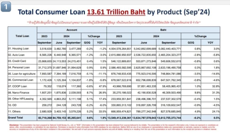 Public : 21/11/2024นายสุรพล โอภาสเสถียร ผู้จัดการใหญ่ บริษัท ข้อมูลเครดิตแห่งชาติ จำกัด (เครดิตบูโร) เปิดเผยว่า รายงานภาระหนี้สินภาคครัวเรือนจากสถาบันการเงิน 157 แห่ง ที่เป็นสมาชิกของเครดิตบูโร ครอบคลุมประชาชนคนไทยและผู้มีถิ่นฐานในประเทศไทยที่มีหนี้สินกับสถาบันการเงินสมาชิก ซึ่งปัจจุบันครอบคลุมประมาณกว่า 30 ล้านคนจากฐานข้อมูลสถิติที่ไม่มีตัวตนในไตรมาส 3 ปี 2567 มีรายละเอียด ดังนี้