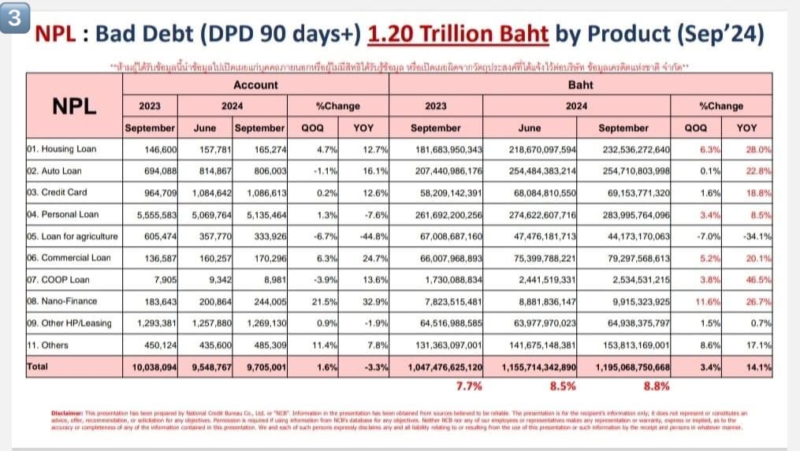 ภาพที่ 2 ระดับของหนี้เสีย หรือ NPL (Non-Performing Loan) ก็เป็นไปตามคาดมาอยู่ที่ประมาณ 1.2 ล้านล้านบาท คิดเป็นสัดส่วน 8.8% ของหนี้รวม 13.6 ล้านlล้านบาท คือเส้นสีแดงที่พุ่งขึ้นมาชัดเจนตั้งแต่ไตรมาส 1 ปี 2566 พักฐานไตรมาส 4 ปี 2566 แล้วไปต่อตั้งแต่ปี 2567 พร้อม ๆ กับมาตรการกลับไปสู่ความเป็นปกติ (normalize) เศรษฐกิจค่อย ๆ โตกลับมาอย่างเชื่องช้า มีเรื่องการให้กู้อย่างรับผิดชอบ การแก้หนี้เรื้อรัง และแก้หนี้ครบวงจร ภาพของเส้นหนี้เสียวิ่งจาก 7.7% สู่ 8.8%