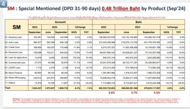 ภาพที่ 4 หนี้กำลังจะเสียหรือหนี้ที่ต้องจับตาเป็นพิเศษ หรือ SM (Special Mention) ยอดคงค้าง Q3 ปี 2567 มาหยุดที่ 4.8 แสนล้านบาทโดยประมาณ ลดลงมาทั้ง YoY และ QoQ