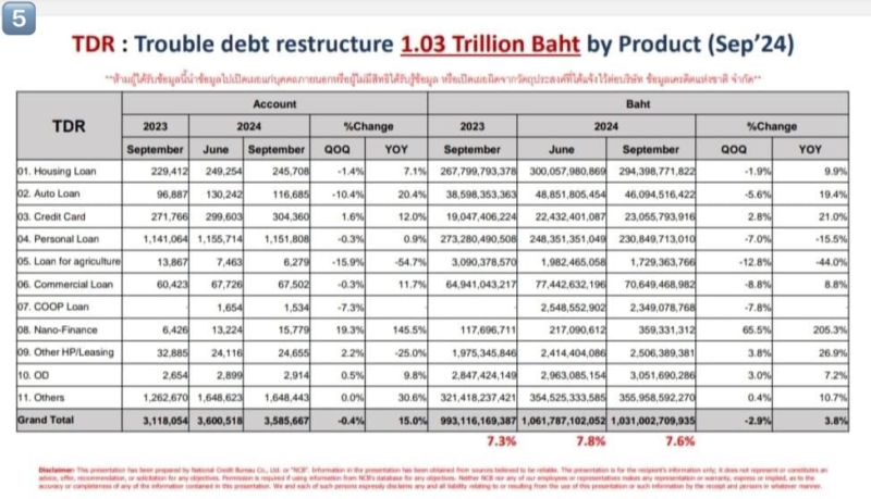 2 ภาพสุดท้าย คือ การปรับปรุงโครงสร้างหนี้ที่มีปัญหา (Troubled Debt Restructuring: TDR) ซึ่งตัวเลขสะสมมาอยู่ที่ 1.03ล้านล้านบาท คิดเป็นสัดส่วน 7.6% ของ 13.6 ล้านล้านบาท เติบโต QoQ ติดลบประมาณ 3%