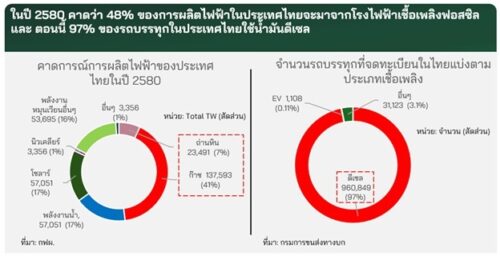 ตามแผนพัฒนากำลังผลิตไฟฟ้า (PDP) ฉบับปัจจุบัน คาดว่าในปี 2580 ร้อยละ 48 ของการผลิตไฟฟ้าทั้งหมดจะมาจากโรงไฟฟ้าที่ใช้เชื้อเพลิงฟอสซิล ขณะที่ร้อยละ 97 ของรถบรรทุกในประเทศไทยยังใช้เครื่องยนต์ดีเซล ซึ่งภาคโลจิสติกส์ยังคงพึ่งพาอยู่