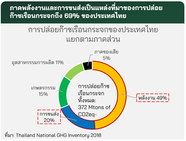 ภาคพลังงานและภาคขนส่งเป็นแหล่งปล่อยก๊าซเรือนกระจกหลักของประเทศไทย คิดเป็น 69% ของปริมาณการปล่อยก๊าซคาร์บอนไดออกไซด์เทียบเท่าทั้งหมด