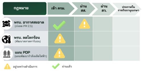 กฎหมายสำคัญ 3 ฉบับที่จะเป็นรากฐานแห่งความสำเร็จของเป้าหมาย Net Zero ได้แก่ พระราชบัญญัติอากาศสะอาด พระราชบัญญัติการเปลี่ยนแปลงสภาพภูมิอากาศ และแผนพัฒนากำลังผลิตไฟฟ้า (PDP) ฉบับปรับปรุง