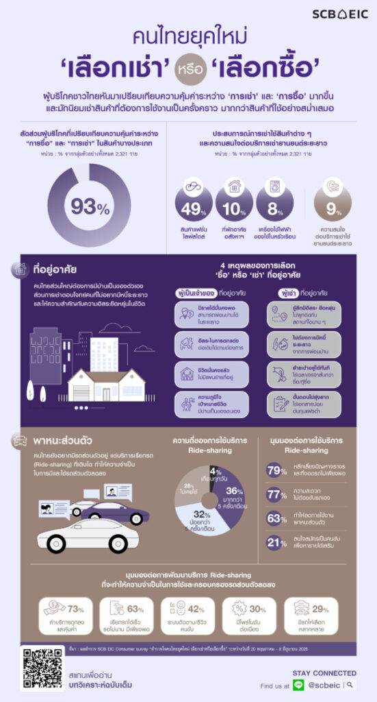 2) แม้ว่าการเช่าใช้ตอบโจทย์ผู้บริโภคที่ให้ความสำคัญกับความคุ้มค่าและความยืดหยุ่น แต่คนไทยส่วนใหญ่ยังมีค่านิยมต้องการเป็นเจ้าของที่อยู่อาศัยและยานยนต์ เพราะมองว่าสินทรัพย์มูลค่าสูงเหล่านี้สะท้อนความมั่นคงและความสำเร็จในชีวิต และ