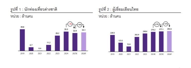 Public : 23/12/2025แนวโน้มท่องเที่ยวไทยดีขึ้นจากแรงหนุนของนักท่องเที่ยวต่างชาติและนักท่องเที่ยวไทยเที่ยวไทย โดยในปี 2569 นักท่องเที่ยวต่างชาติคาดว่าจะอยู่ที่ราว 34.1 ล้านคนฟื้นตัวขึ้นมาเล็กน้อยจากปี 2568 ที่มีแนวโน้มอยู่ที่ราว 32.9 ล้านคนซึ่งอยู่ในภาวะหดตัวจากนักท่องเที่ยวจีนเป็นหลัก โดยการขยายตัวที่ดีขึ้นของนักท่องเที่ยวต่างชาติเป็นผลจากมาตรการภาครัฐที่พยายามเจาะตลาดนักท่องเที่ยวกลุ่มใหม่ที่มีศักยภาพอย่างนักท่องเที่ยวอินเดีย, ยุโรป และตะวันออกกลาง ควบคู่ไปกับการฟื้นฟูความเชื่อมั่นด้านความปลอดภัยของนักท่องเที่ยวจีน