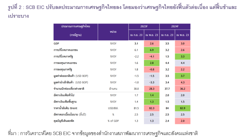 สำหรับมุมมองเศรษฐกิจของ SCB EIC ประเมินเศรษฐกิจไทยมีแนวโน้มฟื้นตัวได้ช้าอยู่ที่ 2.6% ในปี 2023 และ 3.0% ในปี 2024 (รูปที่ 2) โดยปรับลดประมาณการการขยายตัวของเศรษฐกิจไทยในปี 2023 ลงเหลือ 2.6% (จากประมาณการเดิม 3.1%) เนื่องจากเศรษฐกิจไทยในไตรมาส 3 ขยายตัวต่ำกว่าคาดมาก การใช้จ่ายภาครัฐหดตัวสูงขึ้นจากการเบิกจ่ายงบประมาณในปีงบประมาณ 2023 ต่ำกว่าที่ประเมินไว้และความล่าช้าของ พ.ร.บ. งบประมาณฯ ปีงบประมาณ 2024 รวมถึงจำนวนนักท่องเที่ยวจีนที่ฟื้นตัวช้ากว่าคาดการณ์