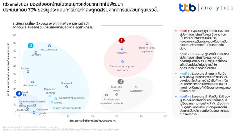 ttb analytics มองว่า ท่ามกลางความสามารถในการแข่งขันของไทยในเวทีโลกที่ลดลงในทุกมิติ รวมถึงมาตรการด้านทางการค้าระหว่างประเทศที่เข้มข้นขึ้น ประกอบกับการกีดกันทางการค้าระหว่างสหรัฐฯ และจีนที่คาดว่าจะยังคงอยู่ต่อไปในภาวะที่เศรษฐกิจจีนชะลอตัว ล้วนจะยิ่งส่งผลกระทบลามไปถึงความสามารถในการแข่งขันของผู้ประกอบการไทยให้ย่ำแย่ลง โดย ttb analytics ได้วิเคราะห์ความเสี่ยง (Exposure) ของผู้ประกอบการในแต่ละอุตสาหกรรมตามระดับการพึ่งพาตลาดต่างประเทศ โดยพิจารณาจากสัดส่วนการส่งออกรวมและสัดส่วนการนำเข้าสินค้าจากจีนเทียบยอดขายรวม ซึ่งจะสามารถแบ่งออกเป็น 4 กลุ่มดังนี้